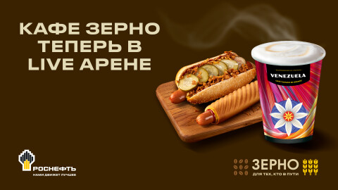 Бренд «Зерно» от компании «Роснефть» стал новым партнёром Live Арены и эксклюзивным поставщиком кофе для гостей площадки.